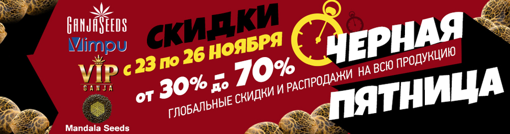 14. Самая большая распродажа - "Черная пятница"!!! В период с 23 по 26 ноября каждый желающий может сделать заказ качественных «орехов» каннабиса от GanjaVIP, GanjaSeeds и Mandala Seeds со скидкой в 30-70%! Обвал цен действует на ассортимент споровых отпечатков торгового бренда Gribo4ek , а также на любой выпуск журнала посвященного культуре каннабиса «JahPub»! Внимание! Впервые наш магазин предлагает приобрести уникальные курительные девайсы из чешского стекла от Vimpu! Условия «Черной пятницы» распространяются на все имеющиеся в наличии бонги, Pipe, Custom и Hummer Bubbler, декорированные чистым серебром и золотом! И это еще не все! Присоединяйтесь в распродаже года на GanjaSeeds! Магазин GanjaSeeds Украина Магазин GanjaSeeds Россия Магазин GanjaSeeds Россия (Зеркало)
