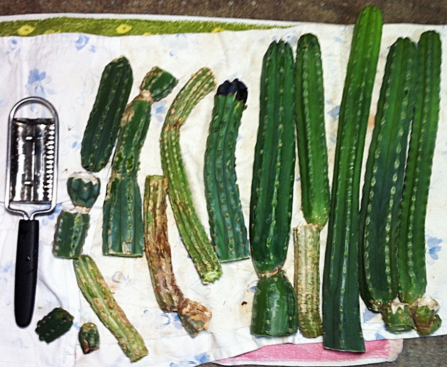 Уже недели три как пришёл к мысли что пора снимать очередной урожай в гроубоксе с кактусами (Сан-Педро, Перувиана торч). С прошлого урожая прошёл год. И вот, наконец-то наступил удобный момент. Срезал большие части стеблей, оставив живые растения с укороченными стволами. У оставшихся стеблей срезал "фаску" чтобы им удобней было пускать новые отростки. Так уже 3-й или 4-й урожай собираю. Дальше самое нудное занятие. Я, на сколько возможно, удаляю иголки. Раньше это делал ножницами. Пальцы постоянно кололись, иглы летели везде и как не старался аккуратней срезать и потом тщательно пылесосить рабочую площадь, всё равно жена умудрялась где-нибудь наступить на иголку, иногда через месяц-два. А теперь эта мудрейшая женщина посоветовала попробовать удалять иглы кухонным девайсом для чистки рыбьей чешуи. Поначалу я сильно сомневался, но метод оказался бомбой! Ножницами невозможно срезать сами пеньки откуда растут иглы, а этот девайс удаляет всю твёрдую игловую составляющую не сильно повреждая кожицу. Афигенная вещь. Вот такие бритые стволы получились, девайс слева: Самые толстые стебли разрезал вдоль и ножом удалил сердцевину (в ней пользы нет). Выкинул тот у которого кожа коричневая. Всё нарезал на кусочки и отправил в слоковыжималку. Получилось чуть больше банки (банка ~ 750мл.) кактусовой жижи фантастической консистенции. :-) Такой мерзкой какая бывает только у кактусов. Ну, наверное, ещё у человеков при сильном насморке похожее из носа выделяется. Жмых, если так можно назвать отработку соковыжималки в случае кактусов, разложен по двум таким же банкам (заполнились где-то на четверть-треть), залит водой с соком пол-лимона и отправлен вариться час на водной бане. Понятия не имею сколько можно варить. В прошлые разы варил не на бане и только пол часа. Вроде, материал получался рабочий, но на сколько - трудно судить, т.к. принимался сразу же после того что выползло из соковыжималки. Не представляю как отдельно его продегустировать - хранить, как понимаю, не получится. Дальше нужно отфильтровать липкую полезную бяку от твёрдостей. В прошлом году придумал для этого использовать заварник с сеткой-поршнем (не помню как называется). Запихнул всё в него и медленно с усилием давил, отделяется неохотно. Если есть тут кактусоводы - было бы интересно узнать какие ещё есть способы употребления и сколько времени лучше варить кактус?